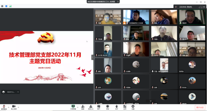 為進一步深入學習貫徹黨的二十大精神,大力弘揚偉大抗疫精神,11月29日上午,集團技術管理部黨支部組織線上開展“聚焦二十大 奮進新征程”主題黨日活動?;顒佑牲h支部書記周燦偉主持,集團黨委委員、總工程師王猛及支部全體黨員、入黨積極分子參加。