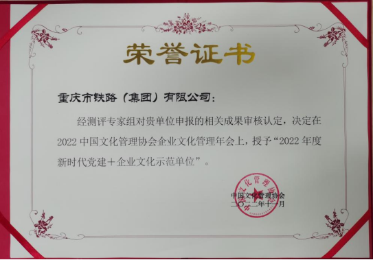 近期,在北京舉辦的中國文化管理協(xié)會企業(yè)文化管理年會上,經專家評選,重慶市鐵路集團榮獲2022年度“新時代黨建+企業(yè)文化示范單位”榮譽稱號,集團黨建引領高質量發(fā)展再上新臺階。