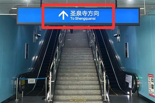 當我們在站廳搭乘扶梯上樓時,頂部會有一塊這樣的藍色標識,上面寫著某個站點的名字,代表從此側扶梯上去搭乘的就是往“XXX”方向的列車。